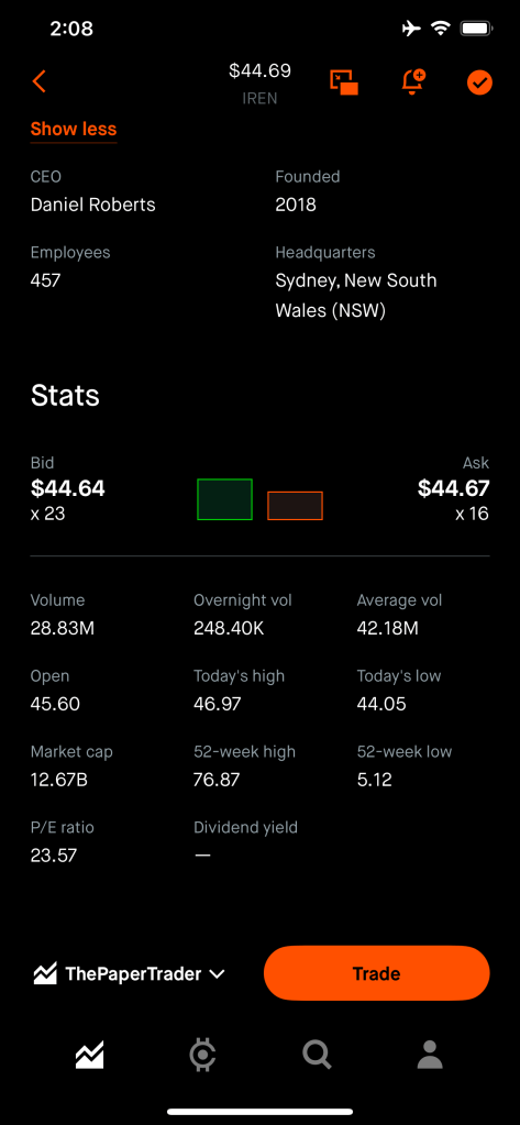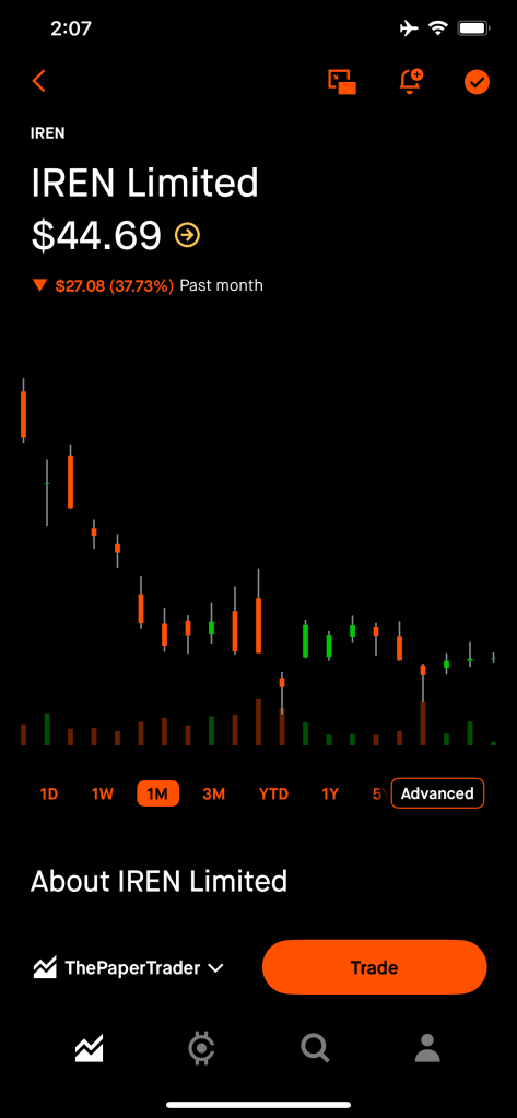 If I’ve heard of Iris Energy, you’ve heard of Iris Energy. IREN, the renewable power, Bitcoin miner/Data center, has been on an upward price tear the last year. Enough so, that social and legacy media are touting its run and adding it to their portfolios. However, in the last month, big grizzlies have been eating any salmon that dare swim upstream. Price has fallen to $44.69, from a 52 week high of $76.87. That fills a Bear like me with a need to paper trade 100 shares, in hopes of price capitulation. If shares could push back towards all time highs, I’ll buy honey for all. If they go bankrupt, I’ll do a losers brag about how I could have lost way more, had I paper traded it a month prior.